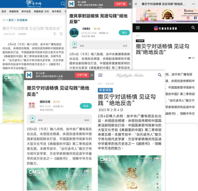 未播先熱!這部當代人幾乎聞所未聞的千古“奇書”,一下子吸引了海內(nèi)外網(wǎng)民目光。海內(nèi)外諸多媒體迅速關注,紛紛報道。截至目前,歐洲華語廣播電臺、匈牙利聯(lián)合報、北歐時報等數(shù)十家海外媒體對第二季內(nèi)容的轉(zhuǎn)發(fā)和報道,已輻射10多個國家和地區(qū),在海外再次掀起“典籍熱”。