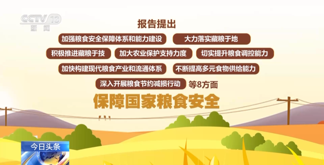 報(bào)告提出,將從加強(qiáng)糧食安全保障體系和能力建設(shè)、大力落實(shí)藏糧于地、積極推進(jìn)藏糧于技、加大農(nóng)業(yè)保護(hù)支持力度、切實(shí)提升糧食調(diào)控能力、加快構(gòu)建現(xiàn)代糧食產(chǎn)業(yè)和流通體系、不斷提高多元食物供給能力、深入開展糧食節(jié)約減損行動(dòng)等8方面,保障國家糧食安全。