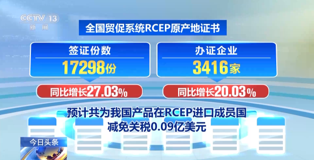 中國貿(mào)促會(huì)8月30日介紹:今年7月份,全國貿(mào)促系統(tǒng)累計(jì)簽發(fā)原產(chǎn)地證書等各類證書54.62萬份,較上年同比增長12.82%。全國貿(mào)促系統(tǒng)RCEP原產(chǎn)地證書簽證份數(shù)為17298份,同比增長27.03%;辦證企業(yè)3416家,同比增長20.03%,預(yù)計(jì)共為我國產(chǎn)品在RCEP進(jìn)口成員國減免關(guān)稅0.09億美元。