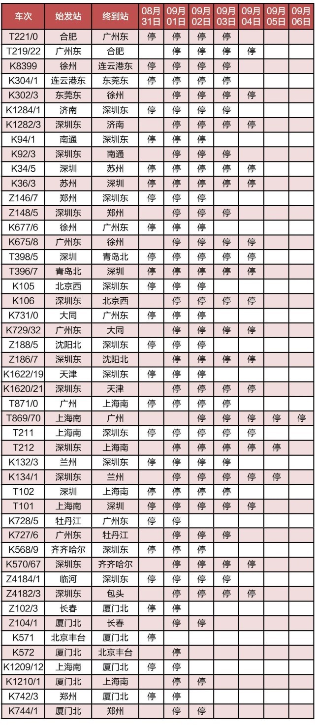 “長(zhǎng)三角鐵路”消息:受第9號(hào)臺(tái)風(fēng)“蘇拉”影響,為確保列車運(yùn)行安全,鐵路部門計(jì)劃對(duì)杭深線、京港高鐵、廣深城際、廣深港高鐵、穗深城際、京九線等線路運(yùn)行的部分列車采取停運(yùn)措施,計(jì)劃停運(yùn)8月31日至9月6日間共121趟旅客列車:其中停運(yùn)動(dòng)車組列車74趟,停運(yùn)普速列車47趟。(停運(yùn)列車車次信息見(jiàn)附表)