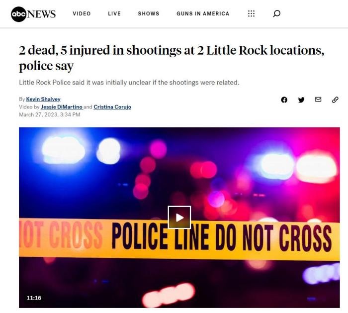 中新網(wǎng)3月27日電 據(jù)美國廣播公司(ABC)報道,當(dāng)?shù)貢r間26日晚,阿肯色州小石城發(fā)生兩起槍擊事件,造成2人死亡,5人受傷。據(jù)美國“槍支暴力檔案”網(wǎng)站27日發(fā)布的最新數(shù)據(jù)顯示,截至目前,美國2023年因槍死亡人數(shù)已接近10000人。