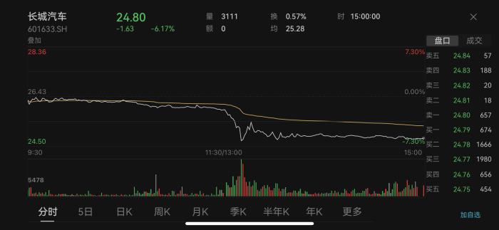 25日盤中,長(zhǎng)城汽車一度跌超7%,比亞迪跌超2%。截至收盤,長(zhǎng)城汽車股價(jià)報(bào)24.80元,下跌6.17%。比亞迪股價(jià)報(bào)255.60元,下跌2.41%。汽車整車板塊則下跌0.85%。有股民留言,“最慘的是同時(shí)擁有重倉長(zhǎng)城汽車和比亞迪的股民,例如我,太慘了?!?/p>