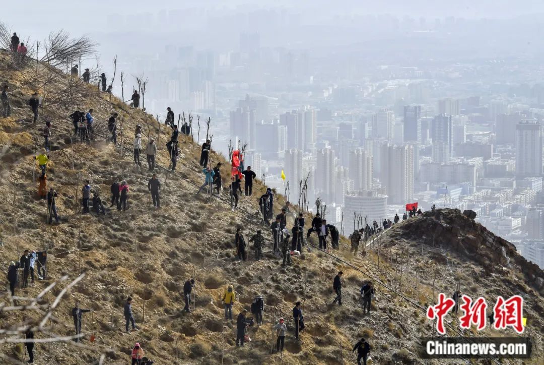 2019年4月,新疆烏魯木齊市沙依巴克區(qū),民眾在雅瑪里克山青年峰下種植樹木。劉新 攝