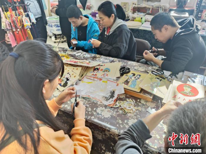 在撫順市非物質文化遺產布貼畫助殘培訓基地,殘疾人制作布貼畫。王晨 攝