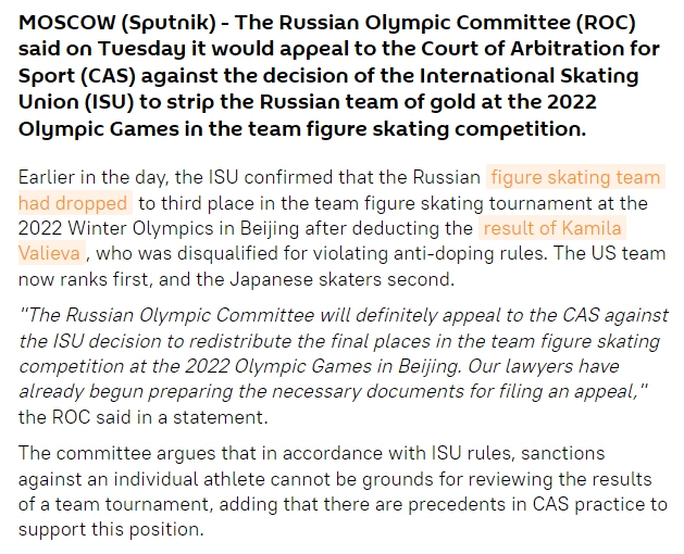 據(jù)俄羅斯衛(wèi)星通訊社報道,俄羅斯奧委會也在當?shù)貢r間30日表示,將針對俄羅斯花滑運動員卡米拉·瓦利耶娃被處以禁賽并取消北京冬奧會俄羅斯奧委會代表團花滑團體金牌一事,向國際體育仲裁法庭提起上訴。