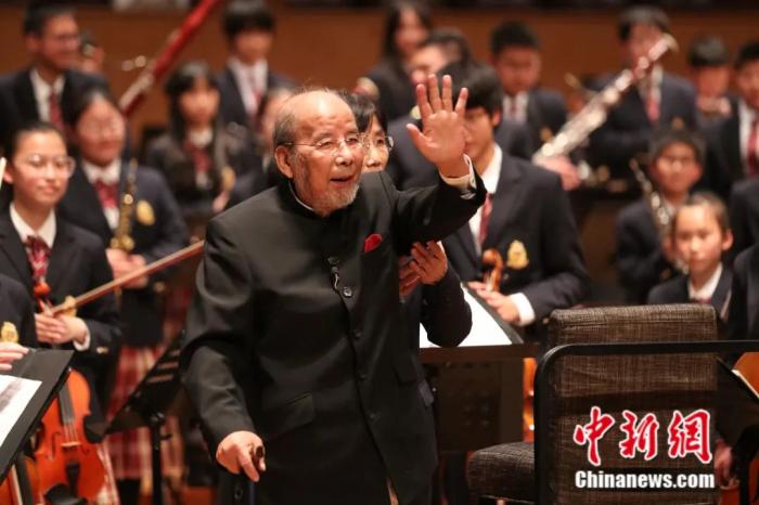 音樂會(huì)的尾聲,99歲高齡的中國(guó)著名指揮家曹鵬在長(zhǎng)達(dá)一分半的掌聲中登上指揮臺(tái)。