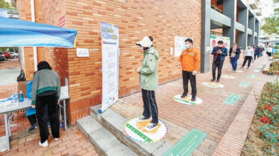 本報訊(記者 李瑤)昨天,東城區(qū)東四街道在轄區(qū)內(nèi)5個常態(tài)化核酸檢測點推出新式“兩米線”,通過充滿童趣的“呼啦圈”地貼,引導居民有序排隊,保持安全距離。“呼啦圈”直徑大約80厘米,中間黃色腳印圖案十分醒目,旁邊還印有疫情防控科普貼,居民站在圈內(nèi)有序排隊等待核酸檢測?!啊粌H富有童趣,使排隊等候不再那么乏味,還嚴格規(guī)定了排隊距離,保證大家的安全。”居民點贊說。本報記者 鄧偉攝