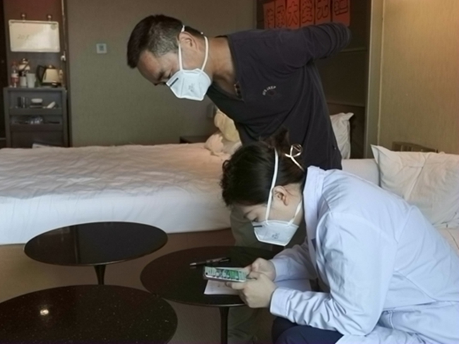 5月4日晚6點(diǎn)多,從香港求醫(yī)歸來(lái)的張氏夫婦懷抱著精神萎靡的哼哼,由機(jī)場(chǎng)大巴閉環(huán)轉(zhuǎn)運(yùn)至海淀區(qū)紅杉集中醫(yī)學(xué)隔離觀察點(diǎn),晚上8點(diǎn)半,到達(dá)酒店辦理入住。來(lái)自四季青醫(yī)院的張龍珍負(fù)責(zé)接待工作,豐富的工作經(jīng)驗(yàn)讓她第一時(shí)間注意到了被母親抱在懷中的哼哼,臉有一些不正常的浮腫,便上前詢問(wèn)情況,得知他患有神經(jīng)母細(xì)胞瘤并轉(zhuǎn)移至腦部及全身時(shí),張龍珍便親自照顧起了這一家人,一步一步指導(dǎo)哼哼爸爸掃碼,填寫(xiě)個(gè)人信息,并在前臺(tái)開(kāi)放綠色通道,快速為他們辦理入住。