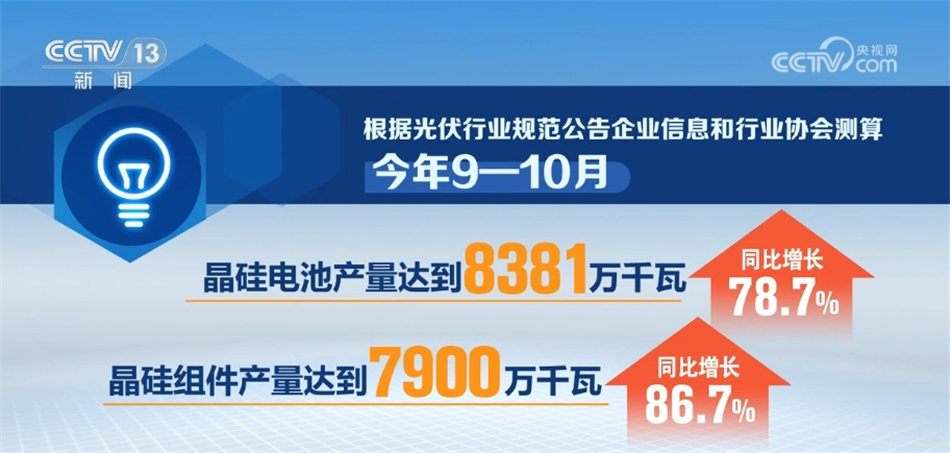 央視網(wǎng)消息:工業(yè)和信息化部12月13日發(fā)布當(dāng)前全國(guó)光伏制造行業(yè)最新運(yùn)行情況。數(shù)據(jù)顯示,今年9—10月,我國(guó)光伏制造業(yè)保持高位運(yùn)行,硅料、硅片、電池、組件產(chǎn)量同比增長(zhǎng)均超60%。
