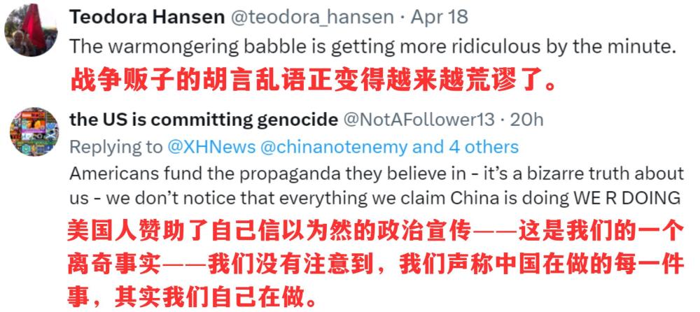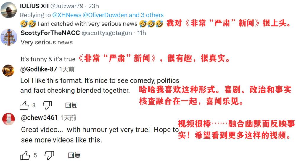 脫口秀播發(fā)后,英國議會議員喬治·加洛韋、倫敦廣播公司主持人丹尼絲·黑德利、倫敦都市大學副教授康斯坦丁諾斯·皮塔基、美國反戰(zhàn)組織“粉色代碼”等機構和個人賬號紛紛轉贊評。網(wǎng)友們在評論區(qū)呼吁:這樣有趣又有料的節(jié)目,多多益善!