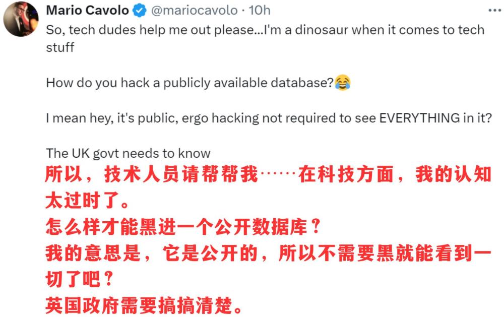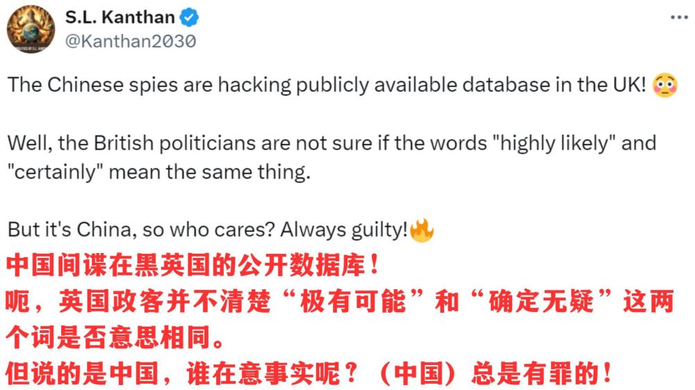 更重要的是,相關政客言論中的邏輯謬誤也讓人不忍直視。脫口秀特意截取了英國議會議員帕特·麥克法登的提問:“副首相為什么認為中國政府會去黑一個公開數(shù)據(jù)庫?”這也讓美國作家馬意駿忍俊不禁: