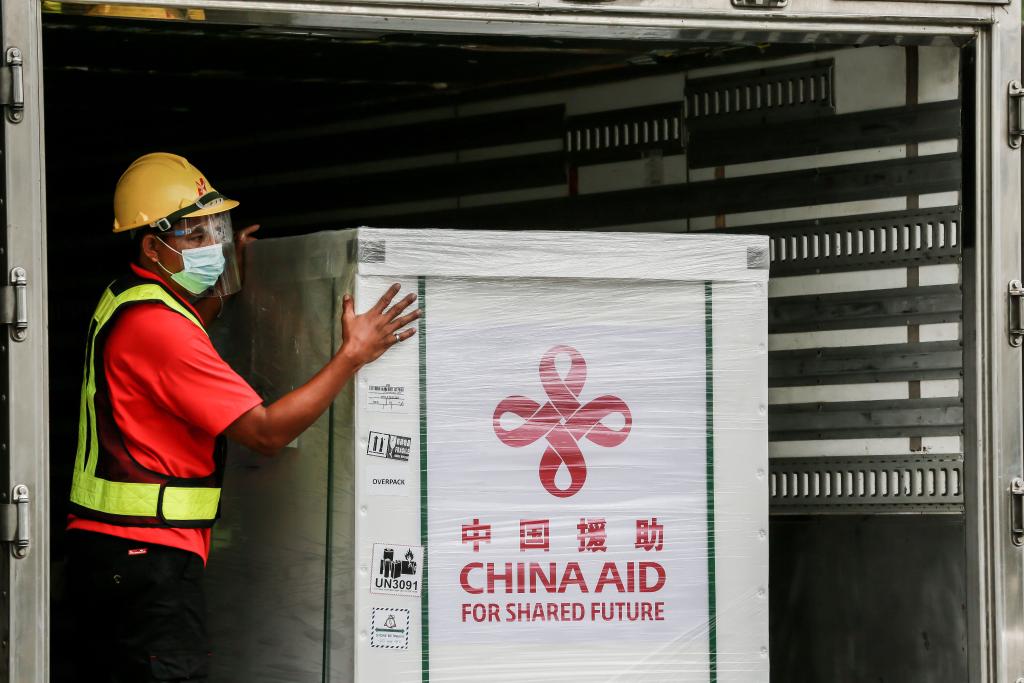2021年3月24日,工作人員在菲律賓馬尼拉國(guó)際機(jī)場(chǎng)搬運(yùn)科興疫苗。新華社發(fā)(烏馬利攝)