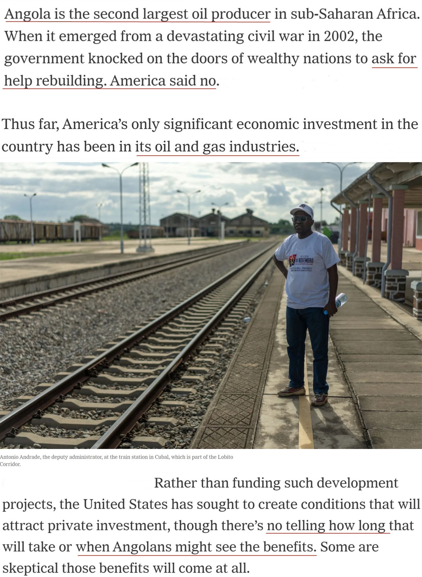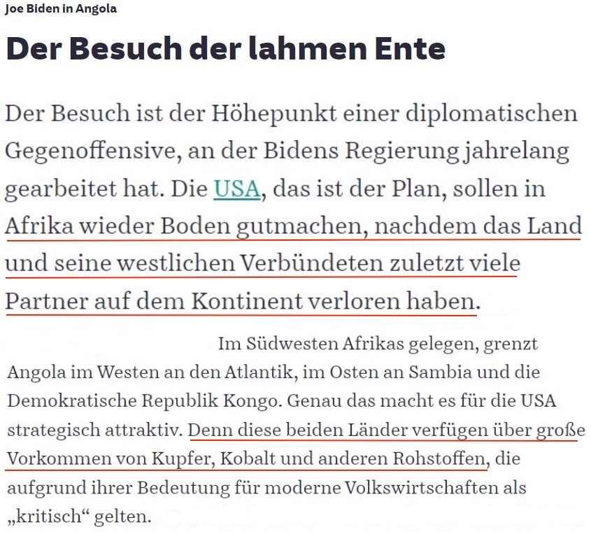《紐約時(shí)報(bào)》日前刊文稱,拜登此訪重點(diǎn)推廣的“洛比托走廊”項(xiàng)目,將鼓勵(lì)私人投資參與項(xiàng)目,因?yàn)槊绹?guó)只提供部分資金。沒(méi)人知道建成這條“走廊”需要多長(zhǎng)時(shí)間,也不知道安哥拉人什么時(shí)候能看到好處。一些人對(duì)這些好處能否實(shí)現(xiàn)持懷疑態(tài)度。