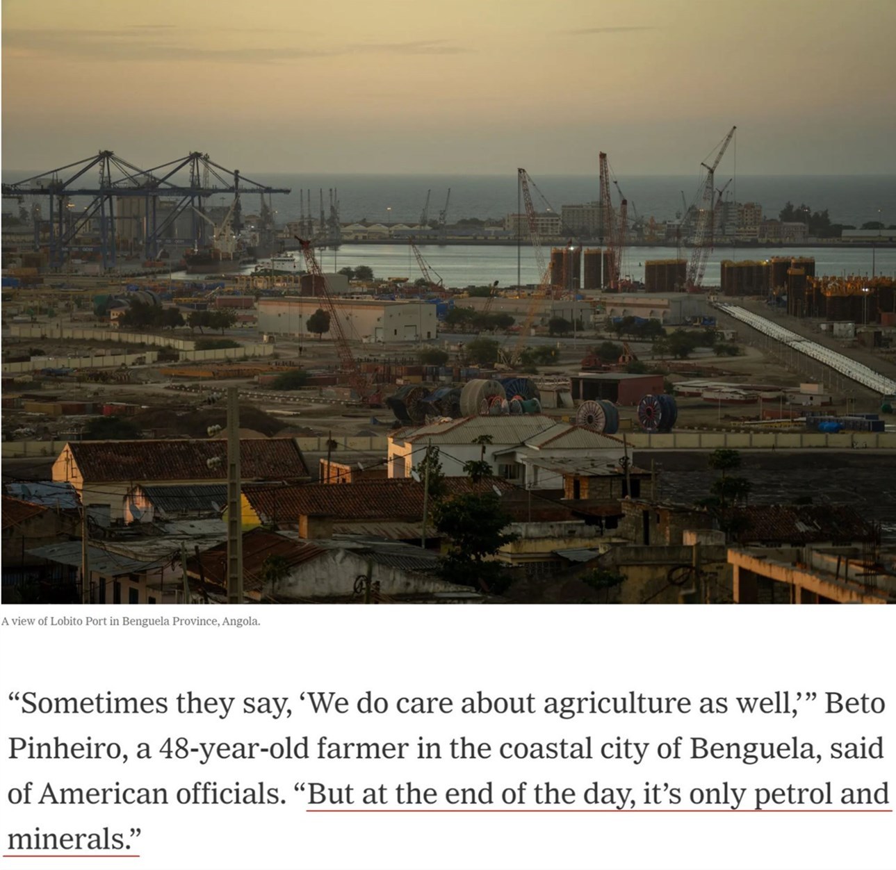 家住安哥拉沿海城市本格拉的48歲農(nóng)民貝托·皮涅羅說(shuō):“有時(shí)他們(美國(guó)官員)會(huì)說(shuō),‘我們也關(guān)心(安哥拉的)農(nóng)業(yè)’……但歸根結(jié)底,(美國(guó)關(guān)心的)只有石油和礦產(chǎn)?!?/p>
