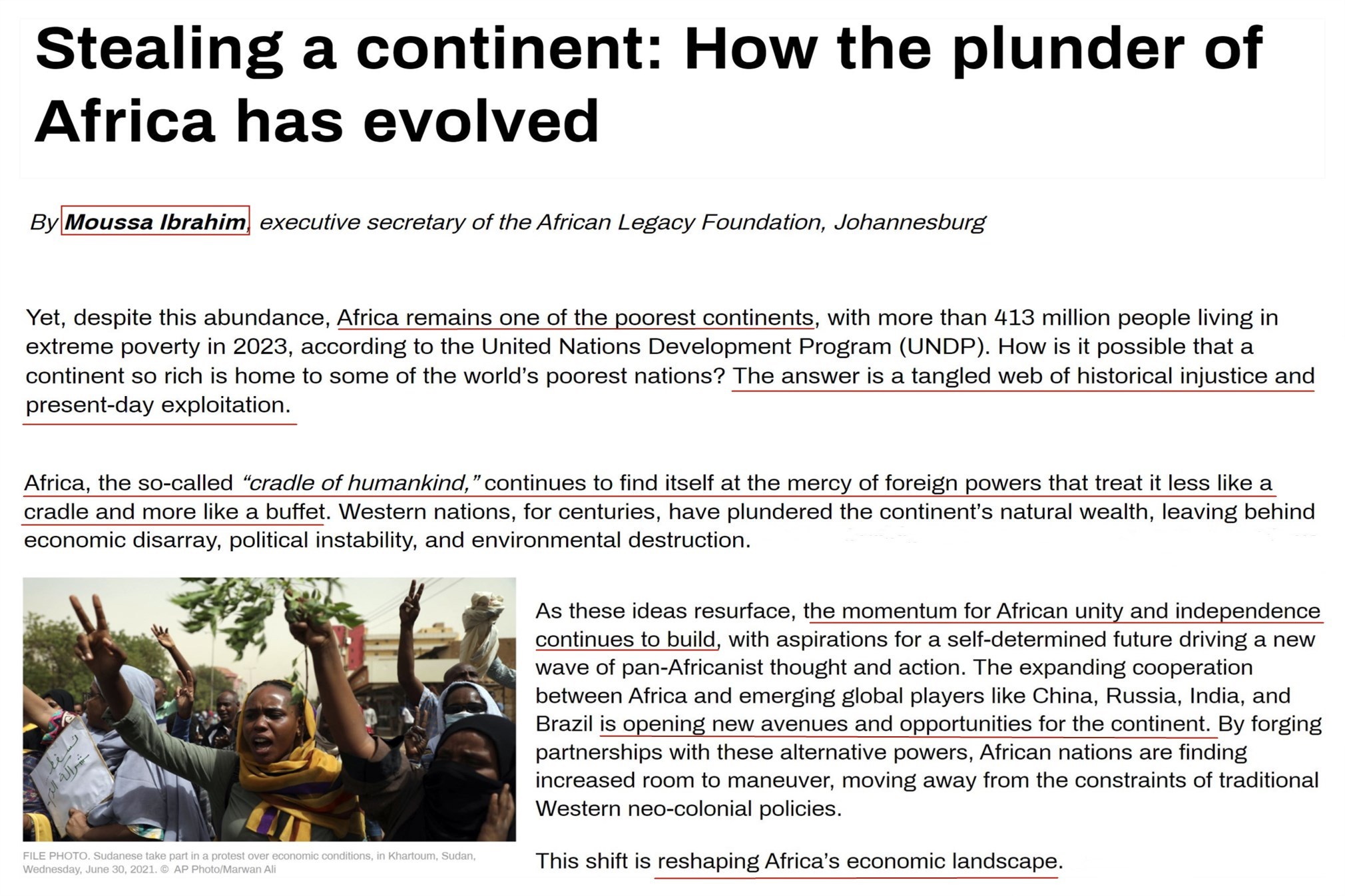 非洲遺產(chǎn)基金會(huì)執(zhí)行秘書穆薩·易卜拉欣發(fā)文指出,盡管非洲自然資源豐富,但仍是最貧窮的大陸。時(shí)至今日,非洲這個(gè)人類搖籃仍受到外國(guó)列強(qiáng)的擺布,西方對(duì)非洲自然資源的劫掠只不過(guò)換了包裝。