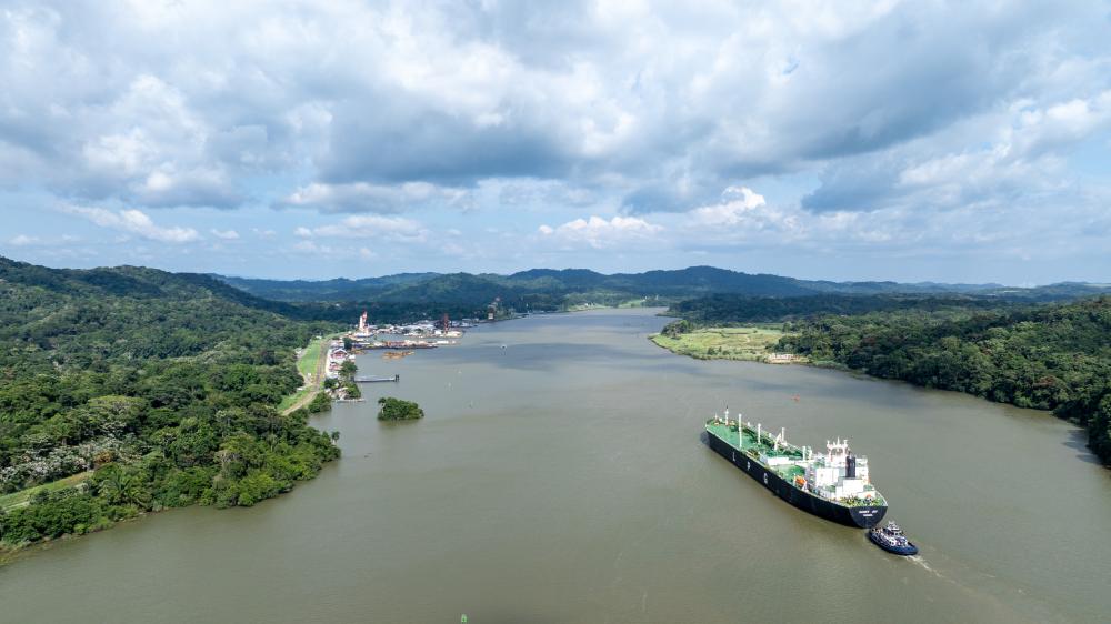 8月28日,在巴拿馬首都巴拿馬城附近,一艘貨輪通過巴拿馬運河的米拉弗洛雷斯船閘準備駛?cè)胩窖蟆P氯A社記者李木子攝