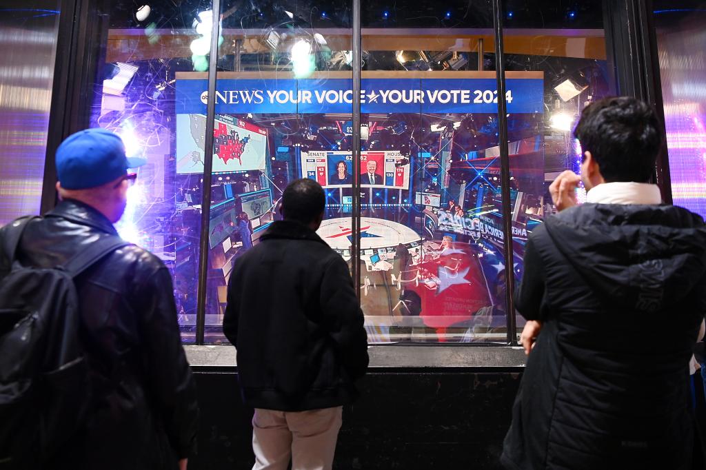 2024年11月5日,人們?cè)诿绹~約時(shí)報(bào)廣場觀看美國總統(tǒng)選舉實(shí)時(shí)出口民調(diào)。新華社記者 李睿 攝