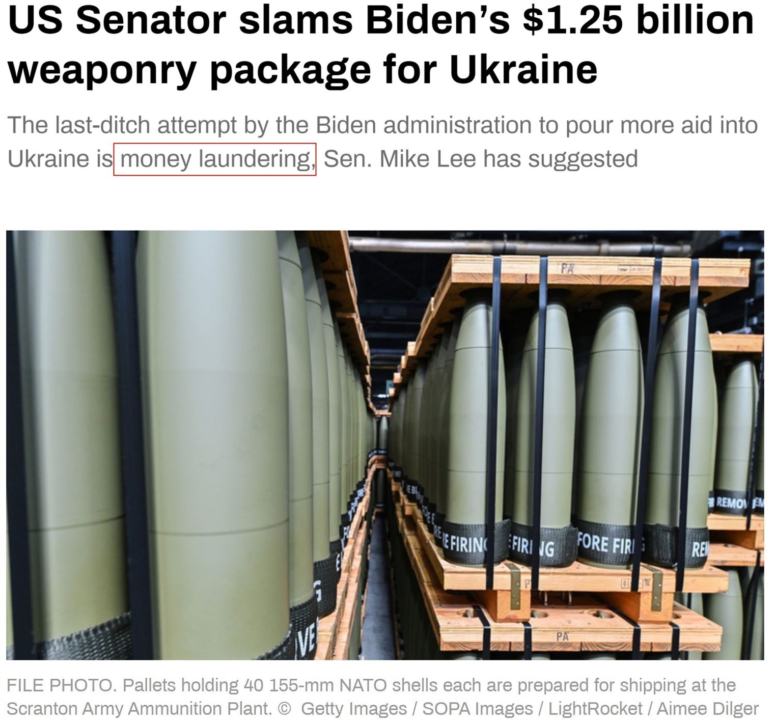 “今日俄羅斯”電視臺(tái)報(bào)道稱(chēng),參議員邁克·李認(rèn)為,拜登政府向?yàn)蹩颂m提供新的“豪華武器包”的提議是“洗錢(qián)”行為。