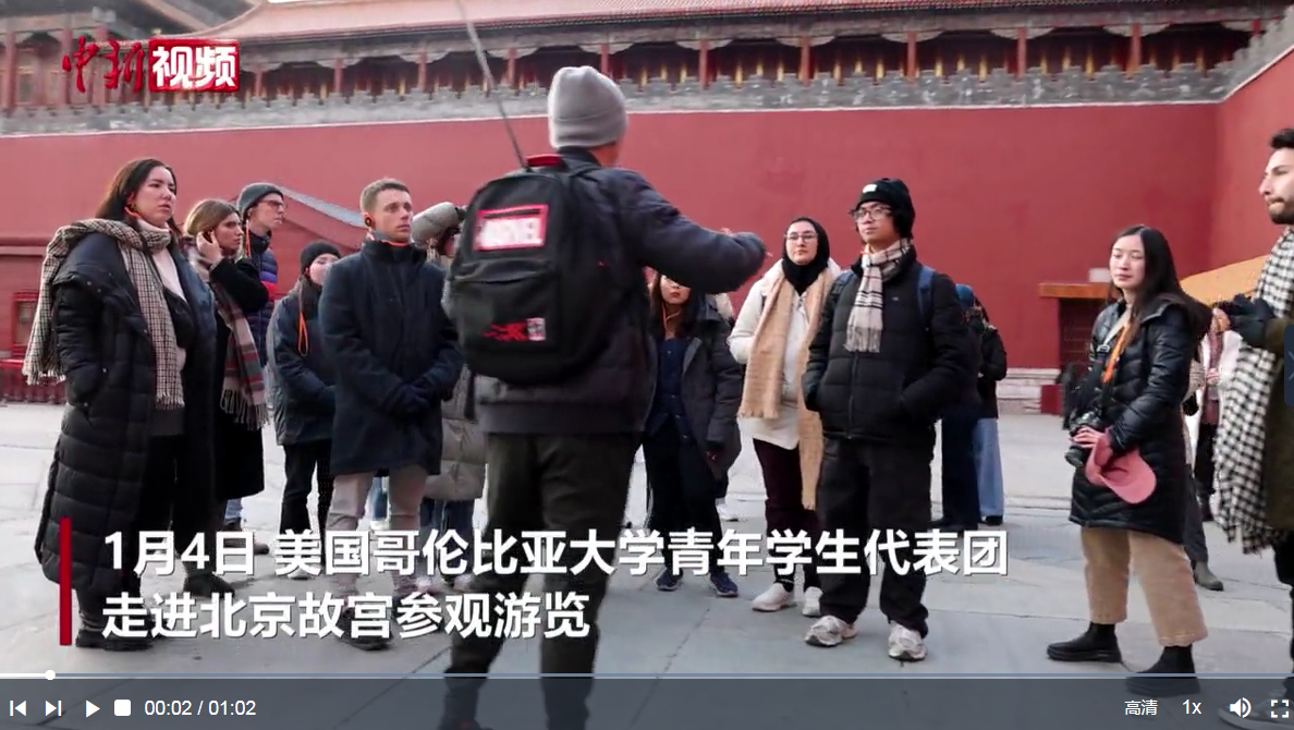 1月4日,美國哥倫比亞大學(xué)青年學(xué)生代表團(tuán)走進(jìn)北京故宮參觀游覽,感受中國古代皇家宮殿建筑群的魅力。2025年新年伊始,美國哥倫比亞大學(xué)青年學(xué)生代表團(tuán)于元旦當(dāng)天抵達(dá)北京。他們將在中國停留10天,相繼訪問北京、西安和上海等多個(gè)城市。代表團(tuán)由哥倫比亞大學(xué)國際事務(wù)和公共管理專業(yè)的27名碩士研究生組成,他們分別來自全球17個(gè)國家。該代表團(tuán)在北京體驗(yàn)傳統(tǒng)的“三件套”——長城、故宮和烤鴨。西安和上海也為他們量身定制了參訪行程。青年學(xué)生們期待著通過這次訪華加深對中國各地的了解,與中國青年交流互動(dòng),成為好伙伴、好朋友。(記者 卞正鋒 制作 王佳琪)