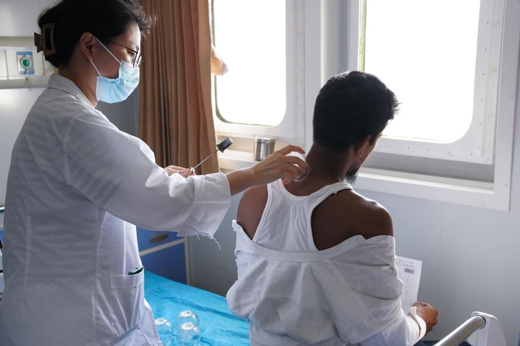 2024年12月24日,在斯里蘭卡科倫坡港,中國海軍“和平方舟”號醫(yī)院船上的醫(yī)生為19歲的小伙穆賈希德拔火罐。(新華社記者伍岳攝)