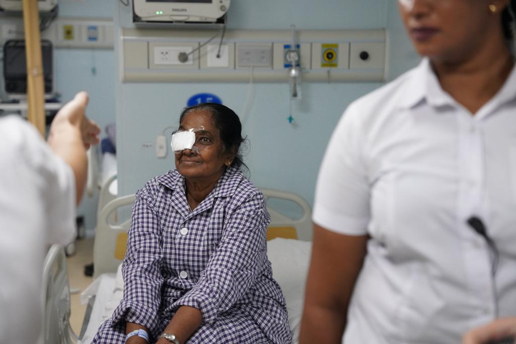 這是2024年12月24日在斯里蘭卡科倫坡港??康闹袊\姟昂推椒街邸碧栣t(yī)院船上拍攝的剛進行完白內(nèi)障手術的本地患者。(新華社記者伍岳攝)