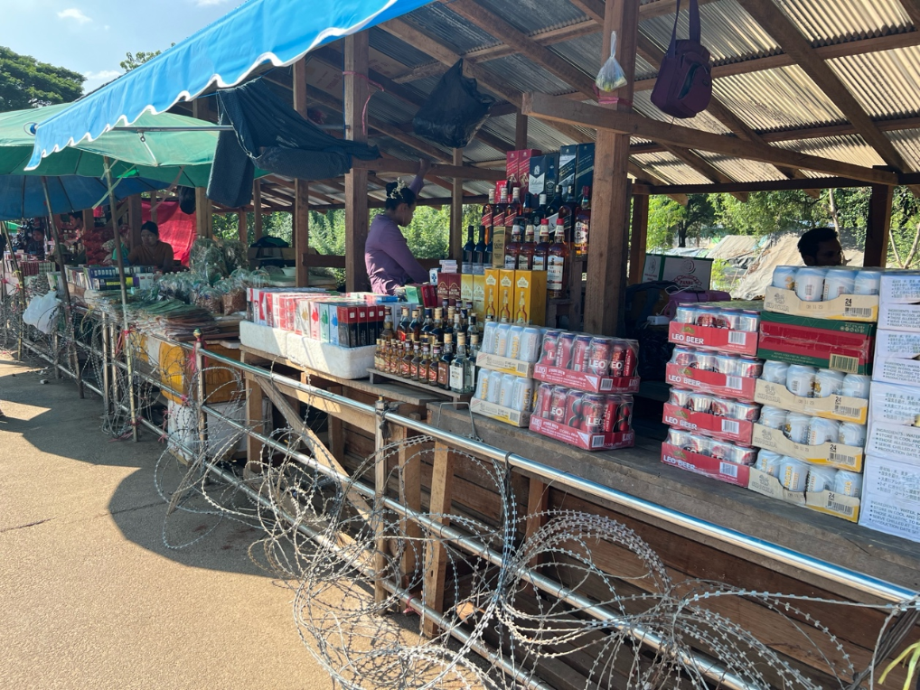 2023年11月27日,在泰國(guó)湄索,緬甸商戶隔著鐵絲網(wǎng)售賣商品。(新華社記者林昊攝)