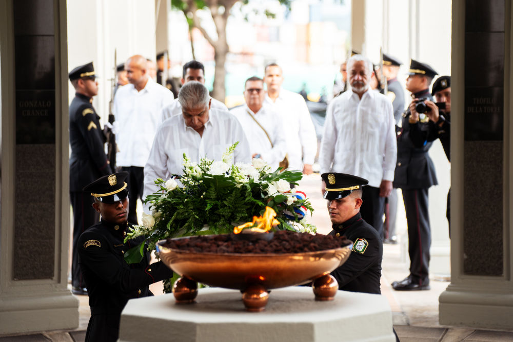 1月9日,在巴拿馬首都巴拿馬城,巴拿馬總統(tǒng)穆利諾(前中)向紀(jì)念1964年“護(hù)旗運動”的“永恒之火”紀(jì)念碑獻(xiàn)花圈。新華社記者許詠政攝