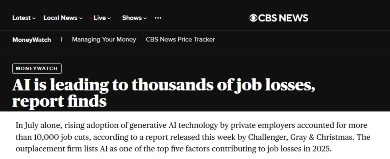 美國哥倫比亞廣播公司刊發(fā)的一篇報道認為,人工智能(AI)技術(shù)已成為美國企業(yè)今年崗位流失的五大主因之一。報道說,自2023年以來,超2.7萬個崗位直接因AI興起被取代,僅今年7月,美國私營企業(yè)因加速采用AI技術(shù),已裁撤超1萬個工作崗位。