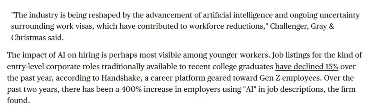 報告分析,人工智能的快速進步與工作簽證政策的不確定性,正在重塑就業(yè)格局。其中,年輕求職者首當(dāng)其沖。過去一年,美國企業(yè)面向應(yīng)屆畢業(yè)生的初級職位招聘量下降15%,而招聘要求中提及“人工智能”的崗位數(shù)量卻激增400%,凸顯技能需求結(jié)構(gòu)性轉(zhuǎn)變。