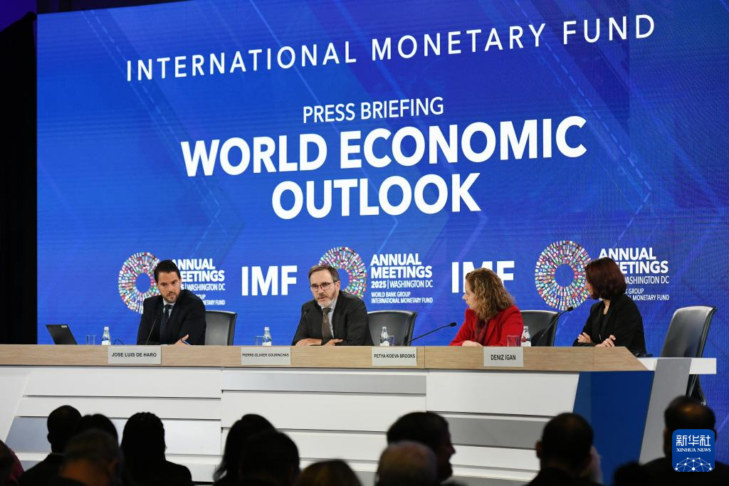 10月14日,在美國華盛頓,國際貨幣基金組織首席經(jīng)濟學家皮埃爾-奧利維耶·古蘭沙(左二)在《世界經(jīng)濟展望報告》新聞發(fā)布會上講話。新華社記者 李睿 攝