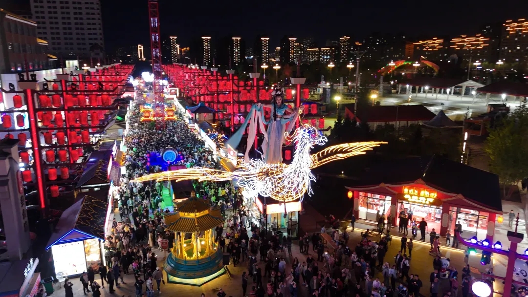 “五一”期間,梅河口東北不夜城寬敞的街區(qū)人流如織,熱鬧非凡。來(lái)自四面八方的游客齊聚東北不夜城打卡拍照。孫池 攝