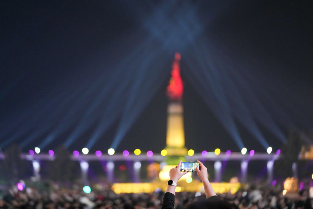 5月3日,人們在哈爾濱防洪紀(jì)念塔廣場觀賞、拍攝光影秀。