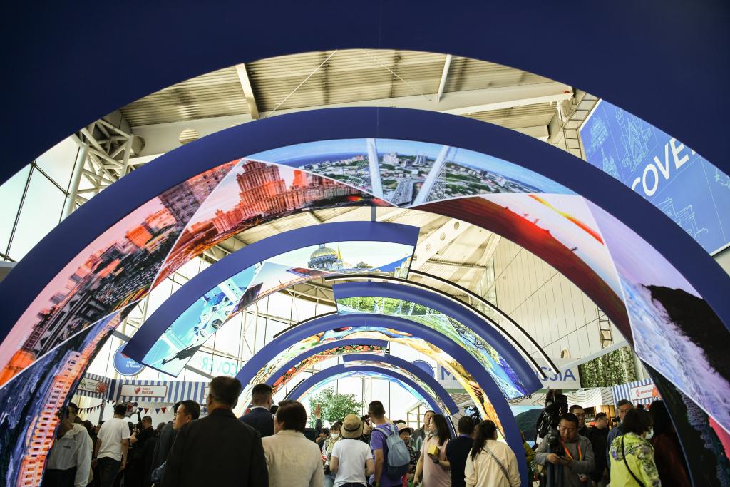 5月18日,參會者走進在哈爾濱國際會展中心舉行的第八屆中俄博覽會展館。新華社記者 王松 攝