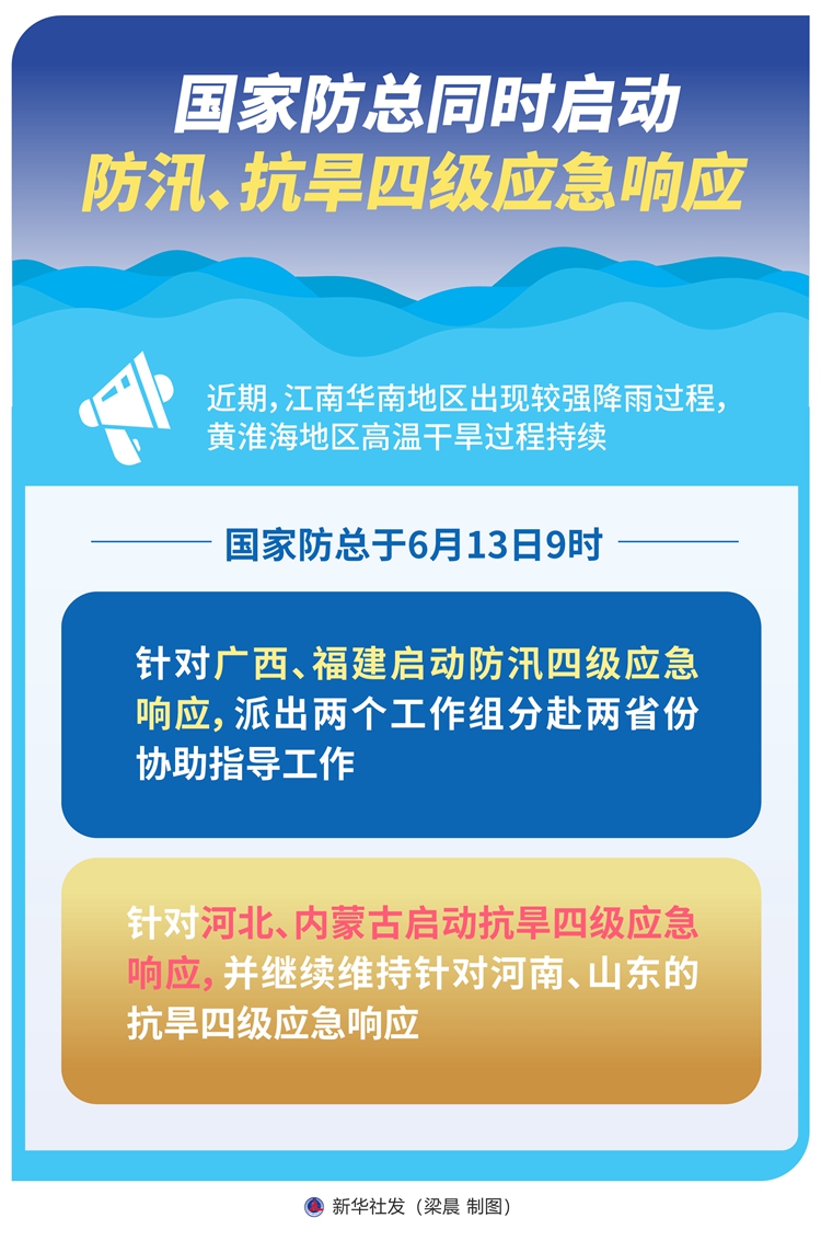 近期,江南華南地區(qū)出現(xiàn)較強(qiáng)降雨過程,黃淮海地區(qū)高溫干旱過程持續(xù)。國家防總于6月13日9時(shí)針對(duì)廣西、福建啟動(dòng)防汛四級(jí)應(yīng)急響應(yīng),派出兩個(gè)工作組分赴兩省份協(xié)助指導(dǎo)工作;針對(duì)河北、內(nèi)蒙古啟動(dòng)抗旱四級(jí)應(yīng)急響應(yīng),并繼續(xù)維持針對(duì)河南、山東的抗旱四級(jí)應(yīng)急響應(yīng)。