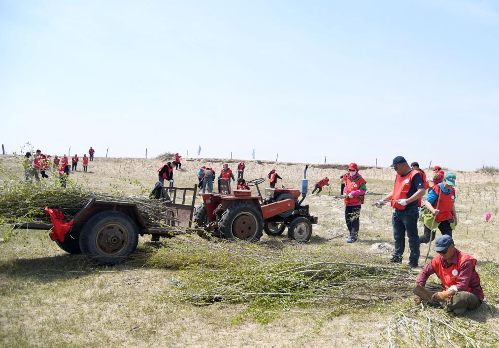 2024年5月6日,在地處渾善達(dá)克沙地的內(nèi)蒙古錫林郭勒盟正藍(lán)旗寶紹岱蘇木扎魯特嘎查,志愿者們開展植綠活動(dòng)。新華社發(fā)(巴依斯古楞 攝)
