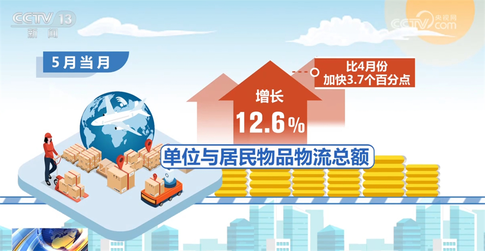 另外,民生消費領(lǐng)域物流需求增速有所加快。1—5月份,單位與居民物品物流總額同比增長11.4%,增速比1—4月份提高0.4個百分點。特別是5月份以來,在假期效應、電商促銷以及消費品以舊換新政策等因素帶動下,與民生消費相關(guān)的物流需求回升明顯,5月當月單位與居民物品物流總額增長12.6%,比4月份加快3.7個百分點。