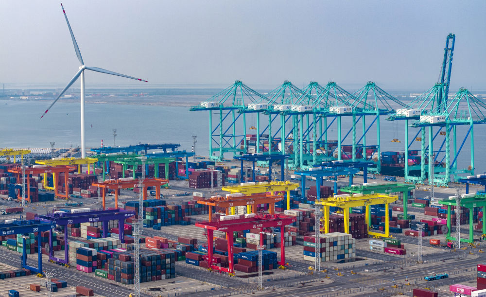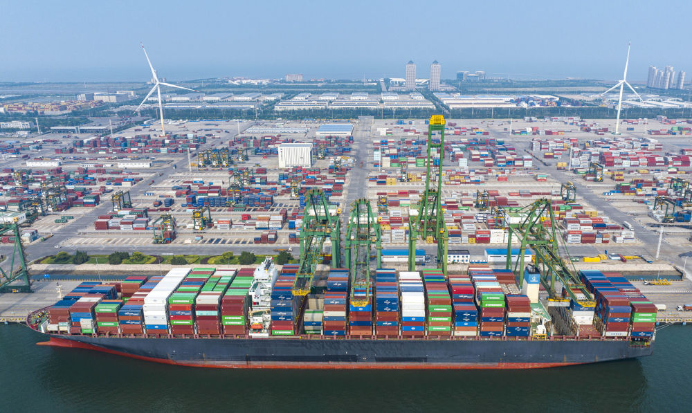 7月3日,一艘集裝箱貨輪停靠在天津港太平洋國際集裝箱碼頭(無人機照片)。新華社記者 趙子碩 攝