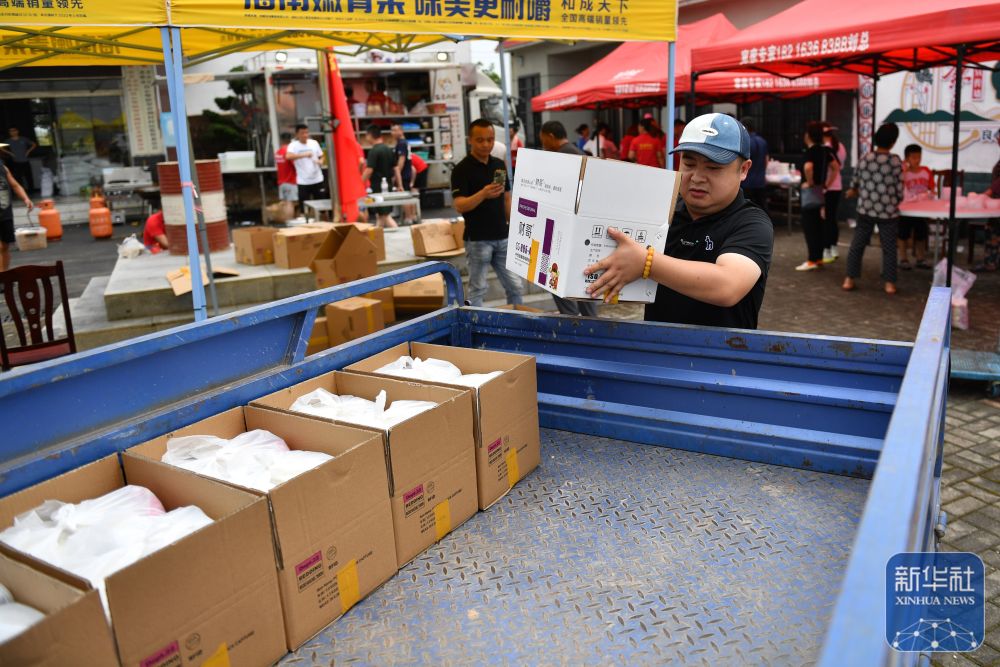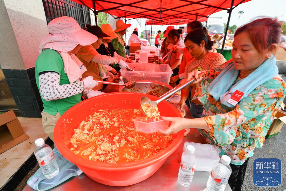 7月10日,在岳陽市良心堡鎮(zhèn)望君洲村,志愿者在打包盒飯。新華社記者 陳思汗 攝
