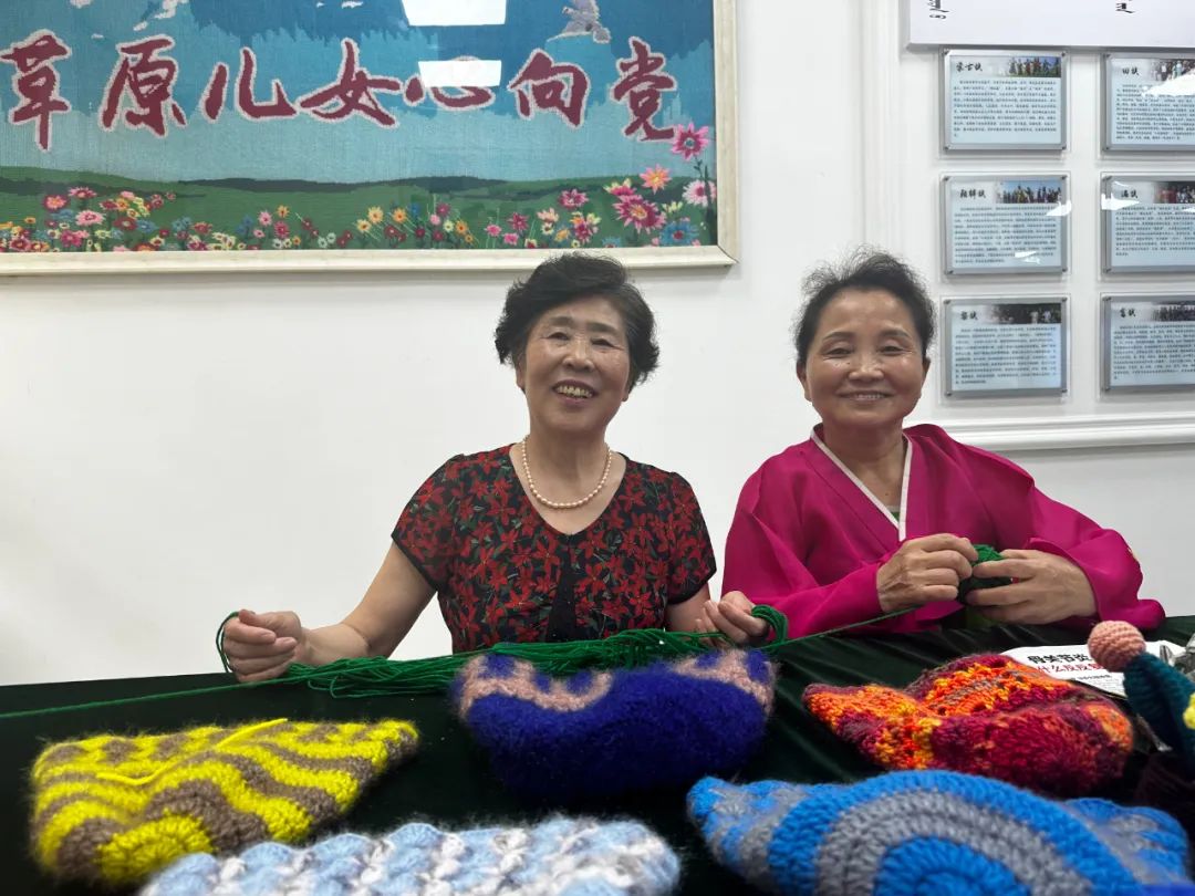 民族工藝傳承區(qū)里,志愿者高娃帶領(lǐng)圍坐桌前的“同學們”編織各類毛線織品,絲線繡出來的花鳥圖案引起記者們的注意。朝鮮族居民李貞子和漢族居民劉海燕是“老搭檔”,屬于“零基礎(chǔ)”學員的她們連續(xù)多年堅持每周上課,即便沒有課程也會來活動中心相互切磋?,F(xiàn)在,課堂上教過的各式民族工藝織品,二人都能信手拈來。