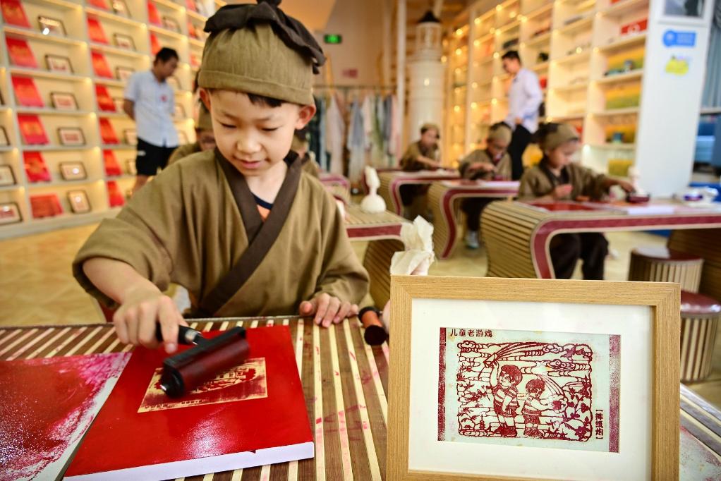 暑假期間,位于青島棧橋書店的印象國(guó)風(fēng)藝術(shù)館舉行拓印研學(xué)活動(dòng),吸引學(xué)生前來(lái)學(xué)習(xí)、體驗(yàn)。新華社記者 李紫恒 攝