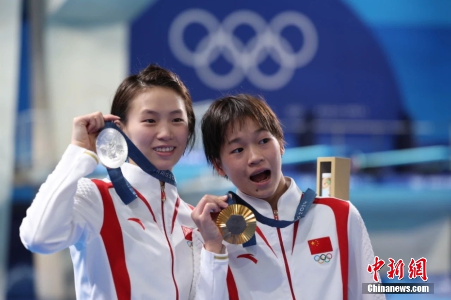 圖為陳芋汐(左)、全紅嬋(右)展示獎(jiǎng)牌。中新社記者 富田 攝
