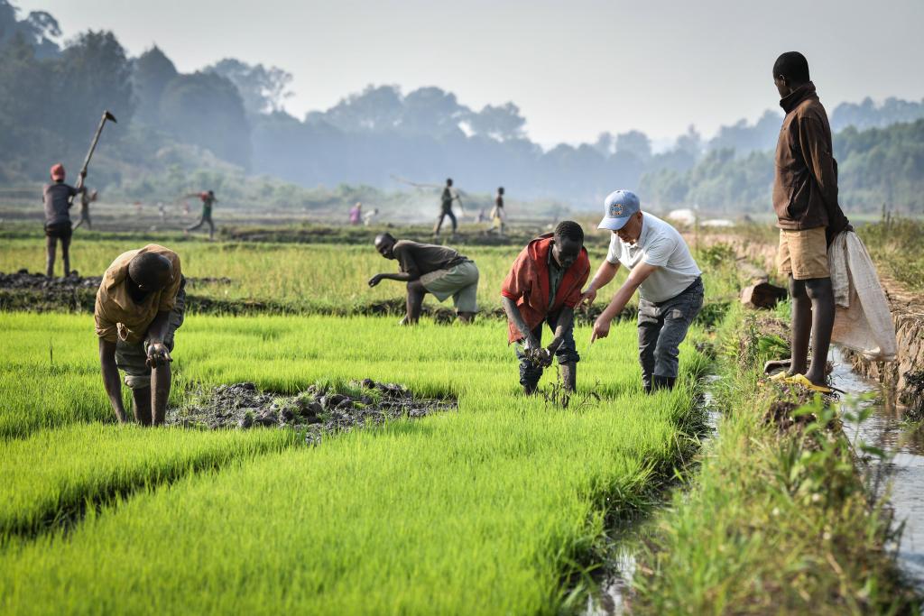 2024年8月14日,在盧旺達南方省胡耶區(qū),水稻專家鄭瑞金(右二)在稻田里指導當?shù)氐巨r(nóng)進行秧苗移栽。新華社記者 韓旭 攝
