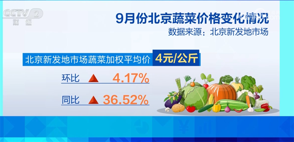 不僅西紅柿,豆角、芹菜、西蘭花等蔬菜也由于產(chǎn)地降雨造成了種植期推遲、上市期延后,近期供應(yīng)偏緊,價(jià)格上漲明顯,像目前芹菜的價(jià)格為每斤3元,比去年同期每斤上漲了2元。整個(gè)9月份,北京新發(fā)地市場蔬菜的加權(quán)平均價(jià)為每公斤4元,比8月份上漲4.17%,比去年同期上漲36.52%。