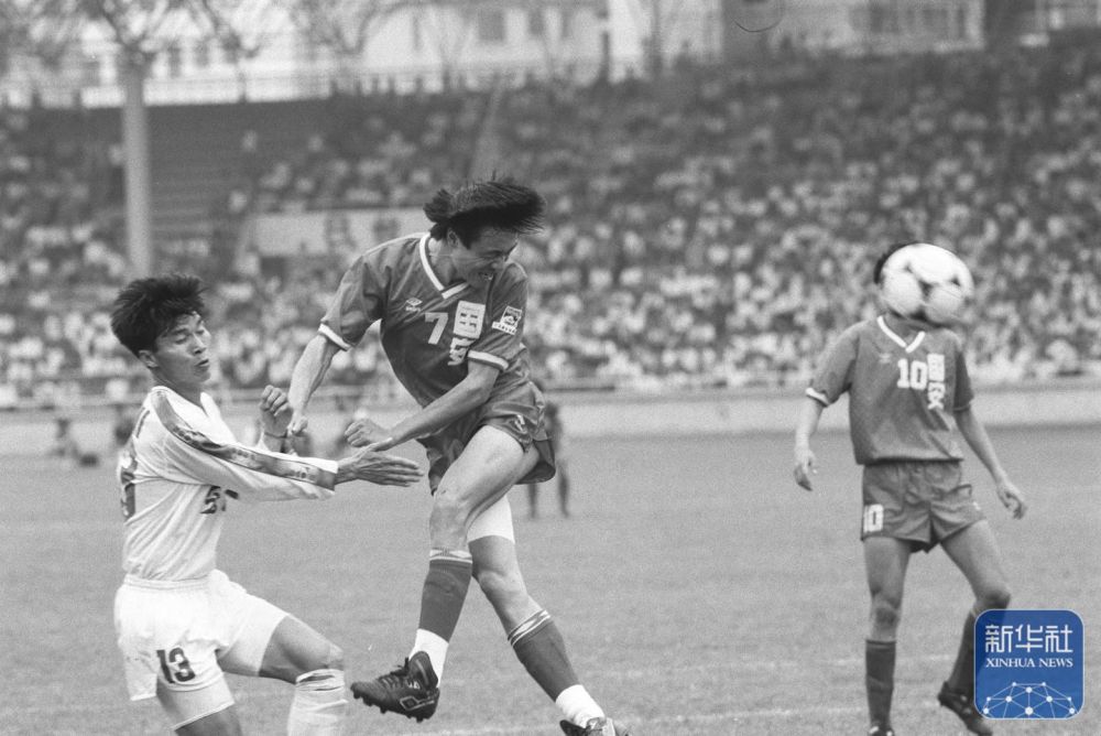 1994是中國(guó)足球職業(yè)化改革元年。這是1994年4月17日,全國(guó)足球甲級(jí)聯(lián)賽全面拉開(kāi)戰(zhàn)幕。廣東宏遠(yuǎn)俱樂(lè)部隊(duì)主場(chǎng)0比2負(fù)于北京國(guó)安俱樂(lè)部隊(duì),這是國(guó)安隊(duì)7號(hào)謝峰(中)在頭球攻門(mén)。 新華社記者 劉彥武攝