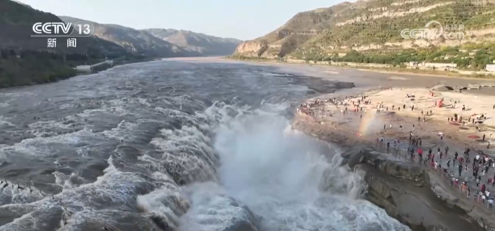 連日來,受上游水庫調(diào)節(jié)放水影響,位于山西吉縣和陜西宜川縣交界的黃河壺口瀑布水量豐沛。從空中俯瞰,黃河流經(jīng)晉陜峽谷到達(dá)壺口,水面由三四百米寬驟然收縮為50多米,再墜入“十里龍槽”,濺起數(shù)十米高的水霧,氣勢磅礴。據(jù)了解,黃河壺口段目前正處于秋汛期,最大水流量約為1300立方米/秒,是日常水流量的3倍,主瀑與副瀑連成一片,呈現(xiàn)出一條線狀,場面壯觀。進(jìn)入10月份以來,黃河壺口瀑布景區(qū)日均接待游客超過2萬人次。