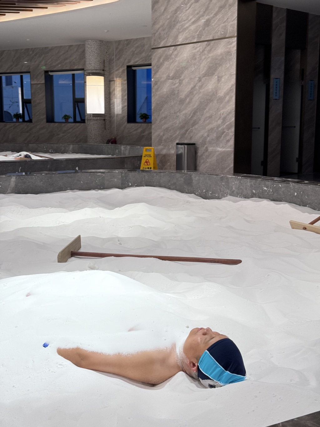 一位游客正在進行礦鹽理療,通過礦鹽覆蓋全身以達到促進血液循環(huán)、疏通經(jīng)絡的作用。 澎湃新聞記者 金向玉 攝