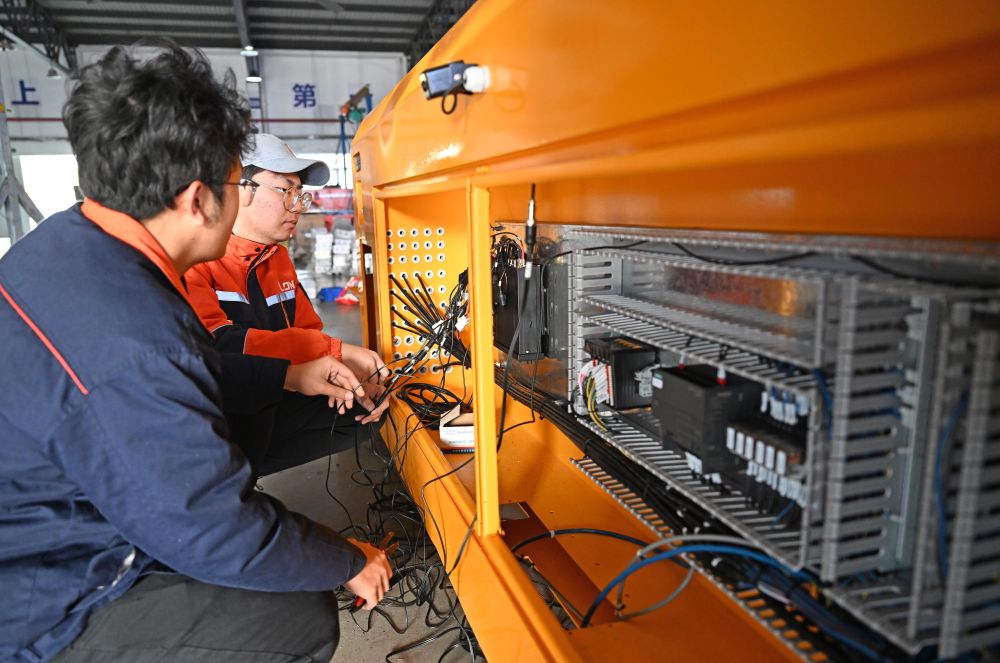 在位于天津市西青區(qū)的天津朗譽(yù)機(jī)器人有限公司生產(chǎn)車(chē)間內(nèi),工作人員在調(diào)試重載自動(dòng)導(dǎo)引運(yùn)輸車(chē)。新華社記者 趙子碩 攝