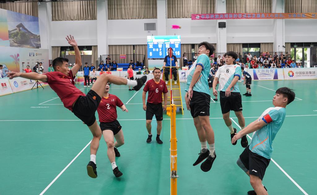 23日,第十二屆全國少數(shù)民族傳統(tǒng)體育運(yùn)動(dòng)會(huì)(以下簡稱“運(yùn)動(dòng)會(huì)”)毽球項(xiàng)目在海南三亞中瑞酒店管理職業(yè)學(xué)院開賽,斗志昂揚(yáng)的西藏隊(duì)與沉穩(wěn)老練的香港隊(duì)在男子三人小組賽中相遇。頭球、倒鉤球、掃堂腿、腳底扣球絕殺……雙方你追我趕,觀眾看得目不轉(zhuǎn)睛。
