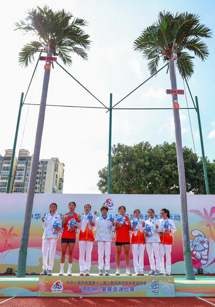24日,第十二屆全國少數(shù)民族傳統(tǒng)體育運(yùn)動(dòng)會(huì)攀椰競(jìng)速比賽結(jié)束爭(zhēng)奪,海南隊(duì)的羅軍和符詩軍分獲男子、女子一等獎(jiǎng)。