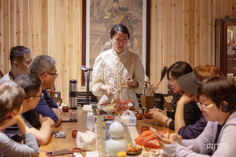 在倒扒獅街,“90后”安慶姑娘秦?zé)o顏是一家文化主題會館的主理人。在她的會館里,檀木、玉石等制作而成的新中式文玩飾品、傳統(tǒng)工藝面料制作而成的“新中式”服裝、古色古香的“新中式”茶館,定期舉行的雅集活動……無一不體現(xiàn)著獨特的東方美學(xué)。2020年,在上海從事珠寶設(shè)計工作的她返回家鄉(xiāng)經(jīng)營起這家文化空間?!凹戎鹦?,也尋根。”她希望,客人來到這里,放慢腳步,在交流與體驗中感受傳統(tǒng)文化的魅力,豐富精神體驗。
